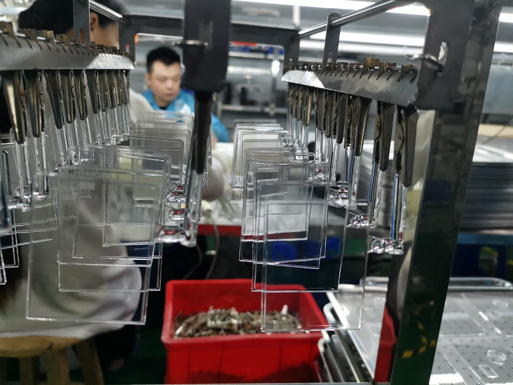 亚克力镜片、显示窗镜片开模注塑、表面硬化、丝印印刷等生产工序,由于镜片类产品高透高光的特性要求,所以生产需在无尘车间 进行。镜片厂对于车间的环境管控需保障10万级以上无尘车间。每道工序的操作员、质检员严格按作业指导和品质标准书操作,才能保障良好出品。